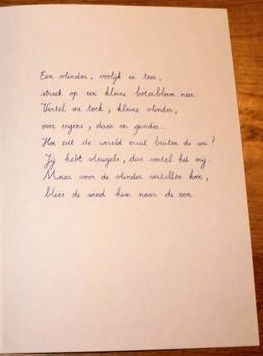verschillende kwaliteiten op de kinderen werken, had ik bij het maken van de spreuken wel in gedachten; maar er bleef naast het proberen de inhoud die me voor de geest stond, in een bepaalde versmaat en rijm te gieten, niet al teveel speelruimte dit ook nog mee te nemen. Naderhand stelde ik soms wel plezierig verrast vast, hoe goed de klanken bij de inhoud van de spreuk en ook voor het betreffende kind pasten, alsof de taal a.h.w. zelf aan het dichten was.