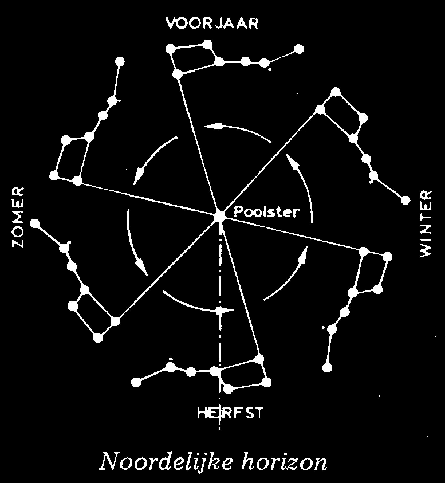 Ook ’s nachts kun je allerlei interessante dingen aan en boven de horizon zien. Je kunt bijvoorbeeld zien dat boven de oostelijke horizon alle sterren schuin omhoog gaan, dat ze boven de zuiderhorizon grote bogen beschrijven, dat ze boven de westelijke horizon allemaal schuin naar beneden gaan en dat ze boven de noordelijke horizon grote cirkels beschrijven rondom de Poolster.