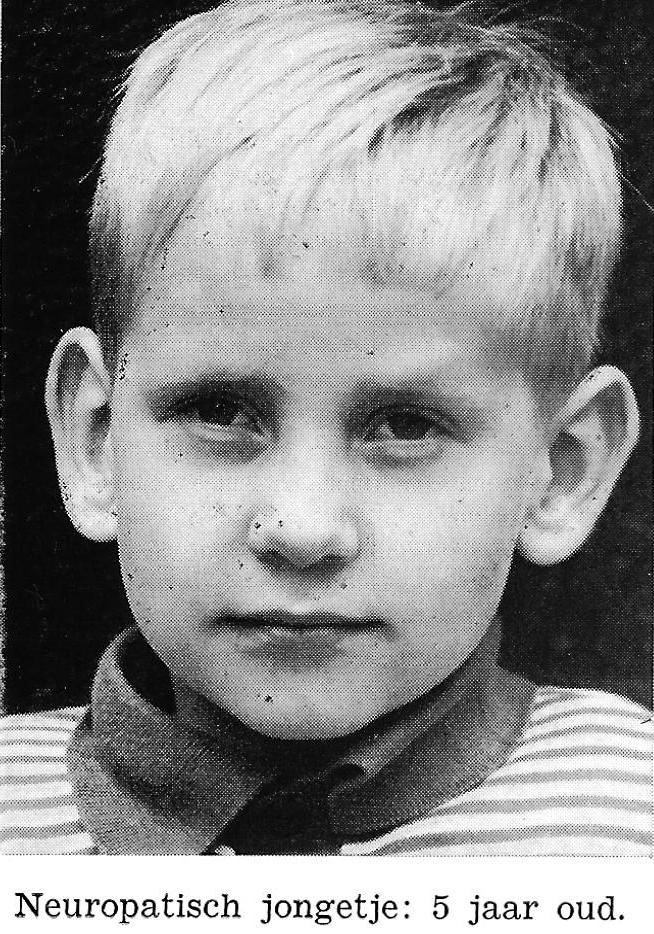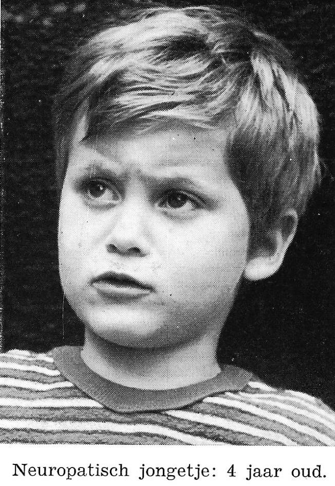 Plotseling is de scène afgelopen. Ja, dat was het. Misschien zou zijn moeder wel gekomen zijn terwijl ze weg waren. Wat is hier gebeurd? Ogenschijnlijk een roerend verhaal van een jongen die de hoop op de komst van de moeder niet tot bewustzijn bracht en nu fixeerde op het schoenen aantrekken, de laatste handeling voordat de groep opbrak voor de tocht. Bij deze kinderen speelt er nog wat anders mee. De komst van de moeder heeft meer iets dwangmatigs, wat moet gebeuren op een bepaald moment, dan dat het verlangen naar het contact zo groot is. Is de moeder er, dan is het schema kloppend en is het contact bijzaak geworden. De heftigheid en het volhouden waren ook buiten elke proportie van een neurotische verdringing. Het schema zou misschien niet kloppen en de angst en de paniek daarover ontlaadde zich op de schoenen, die de laatste handeling waren voor het weggaan. Het had net zo goed een andere jongen kunnen zijn, die hem een duw gegeven had waardoor hij nu niet meer „kon”. Het ware gemakkelijk geweest een voorbeeld te geven van catastrofale reacties bij meer gestoorde kinderen. Daar ziet men elke poging om de dwangmatige handeling te doorbreken gepaard gaan met paniekreacties, waarbij het angstzweet bij deze kinderen uitbreekt. Zo bv. bij een post-encefalitische jongen, als ’s avonds bij het naar bed gaan het bed niet precies dertig cm van de muur stond.