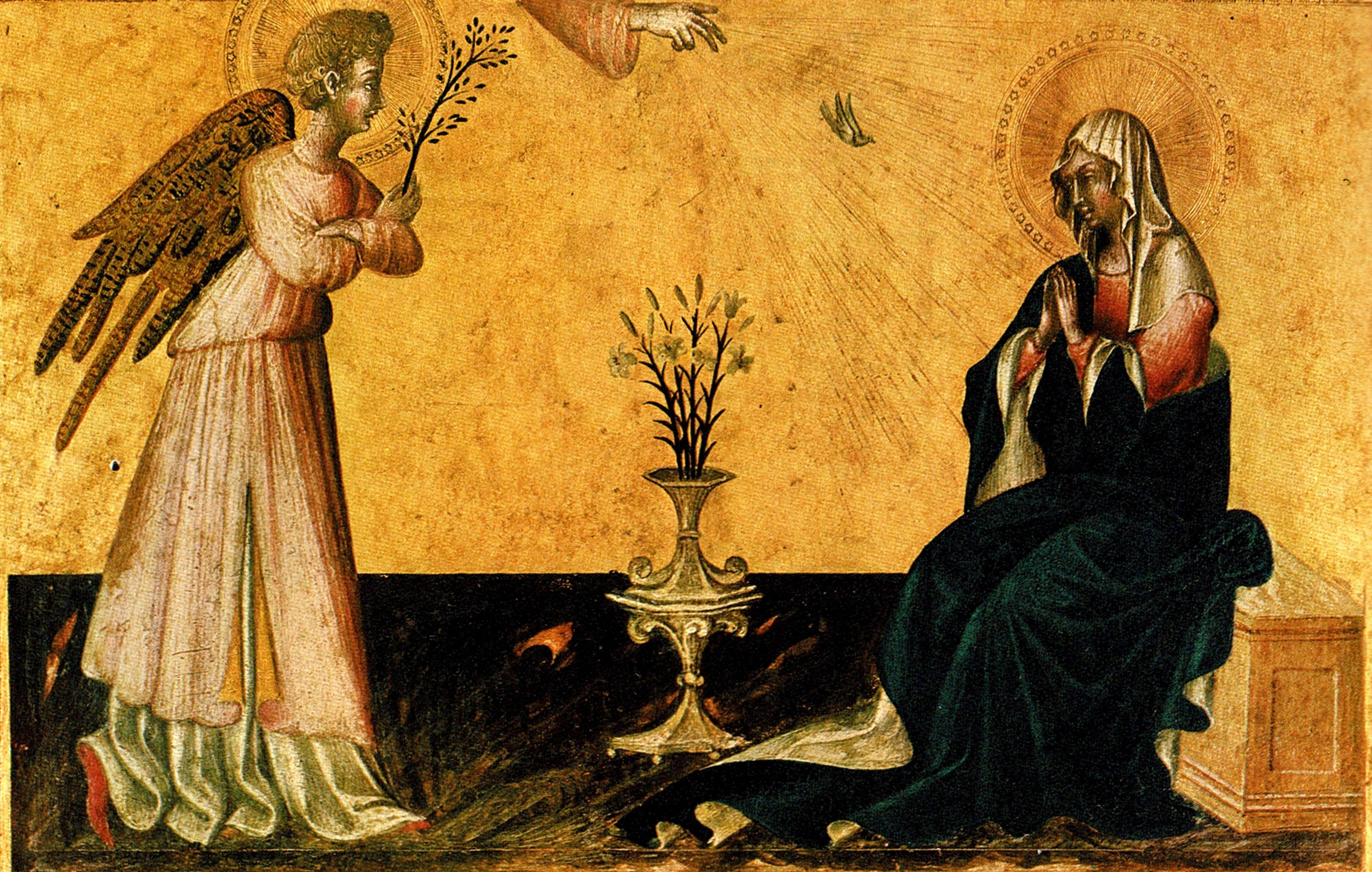 scène uit het kerstspel uit Oberufer ‘de verkondiging van de engel Gabriël aan Maria’.