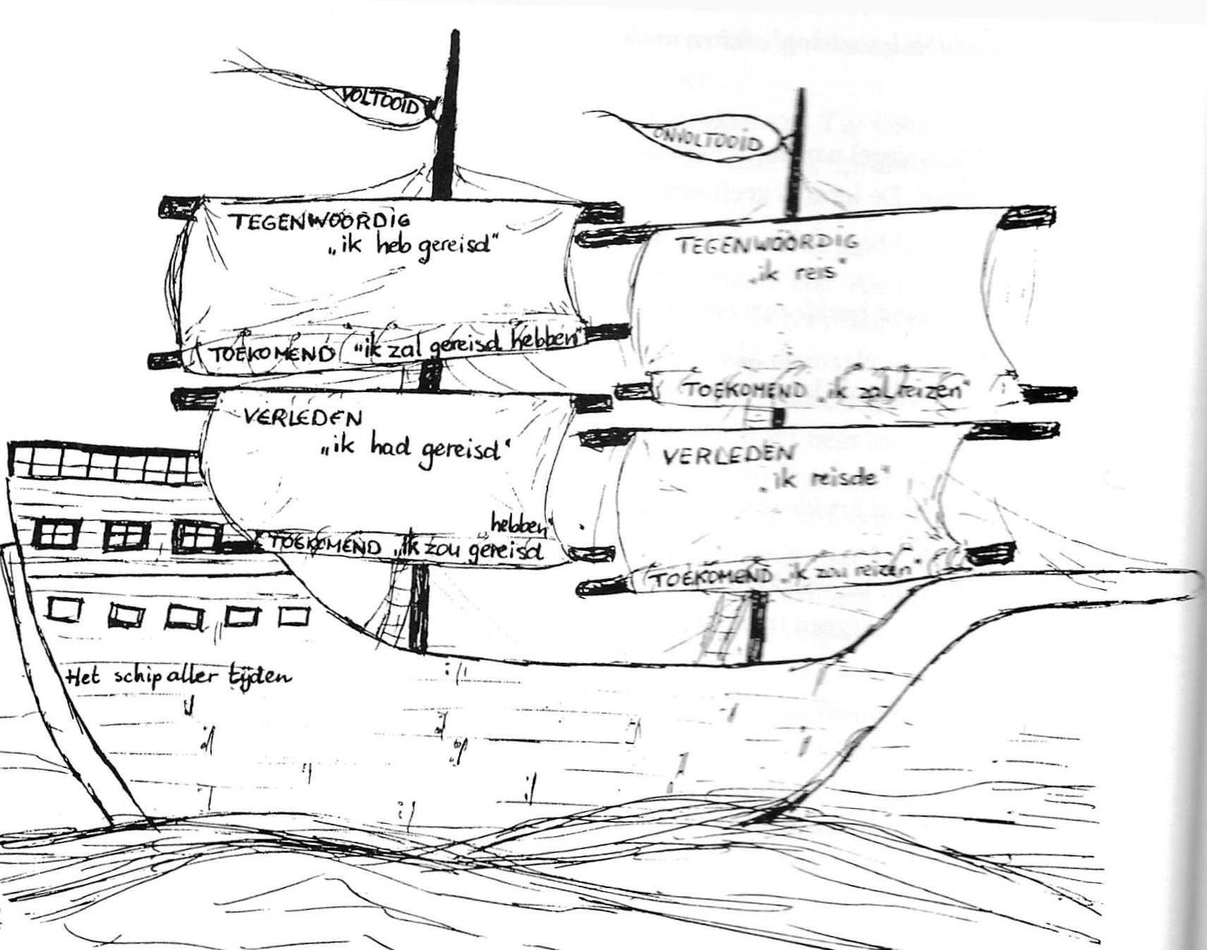 Drie hoofdtijden en drie samengestelde tijden vormen een mooie zeshoek. Elke hoek wordt bezet door een of meer kinderen. Zij hebben elk een ‘spiegelbeeld’ naar binnen. De binnenkinderen geven om beurten de passieve tijden van hetzelfde werkwoord: