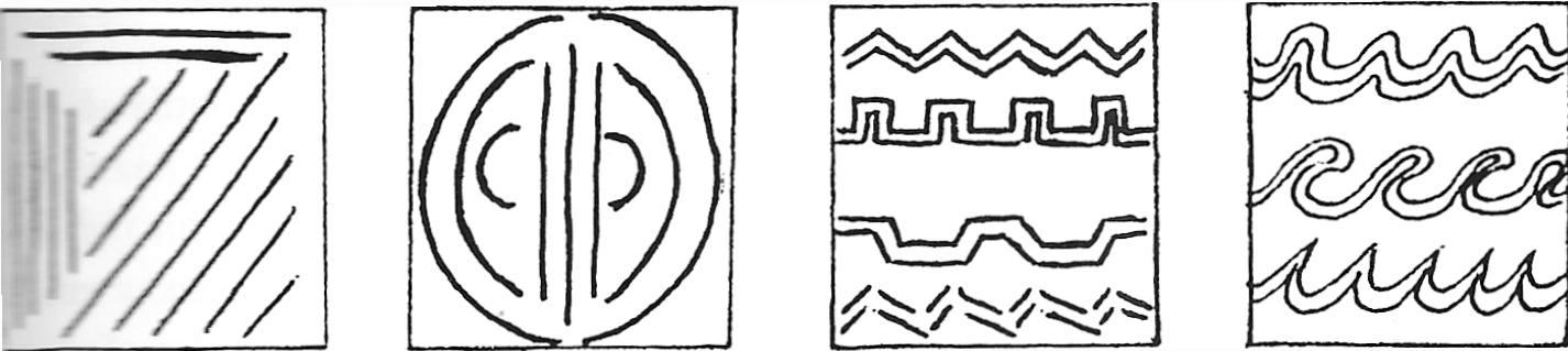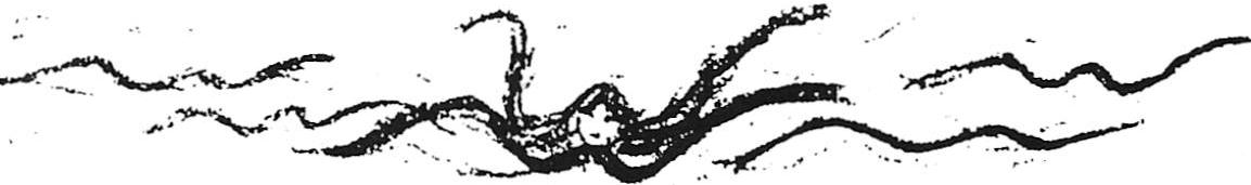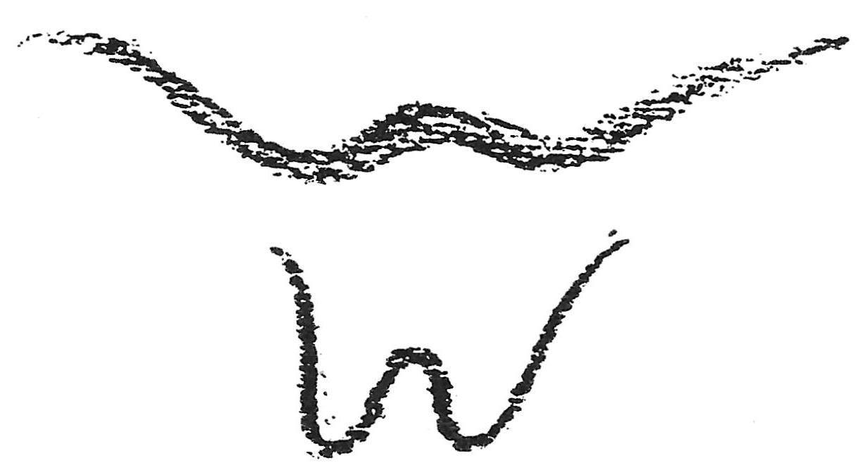 Of ik laat het kind zeggen: ‘WATER’, ik vertel hem hoe water beweegt (zie tekening). Ik Jaat hem dat weer schilderen en breng hem ertoe het begin van het woord ‘WATER’ te zeggen: ‘W . . .’; vervolgens vorm ik de tekening van het water om in de W.