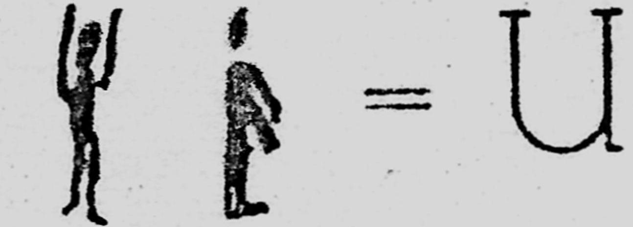 zegt. Maar je laat niet alles naar buiten stromen, je houdt iets binnenin je en dat wordt dan tot dit teken (zie tekening rechts). U kunt eens proberen om dat wat door een klinker uitgedrukt wordt in een tekening weer te geven. Dan krijgt u tekeningen die u in een beeld kunnen vertellen hoe de tekens voor de klinkers zijn ontstaan.