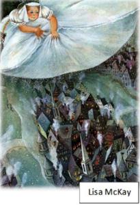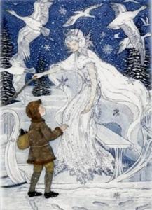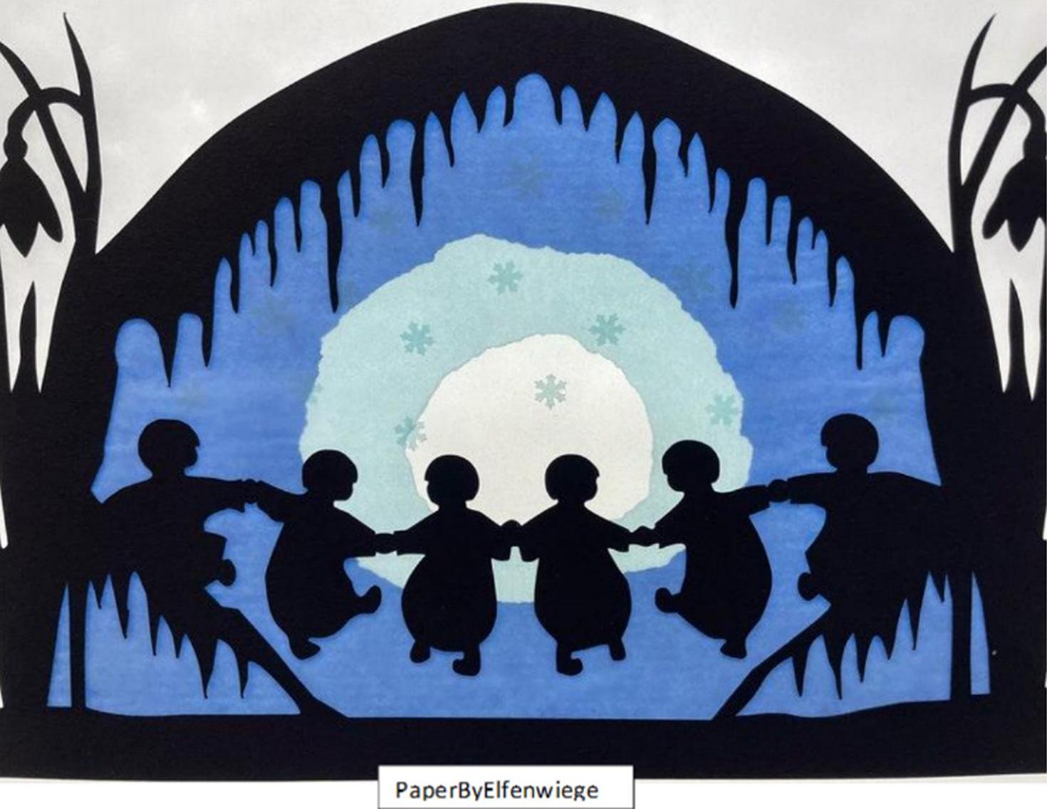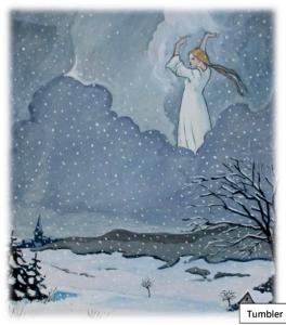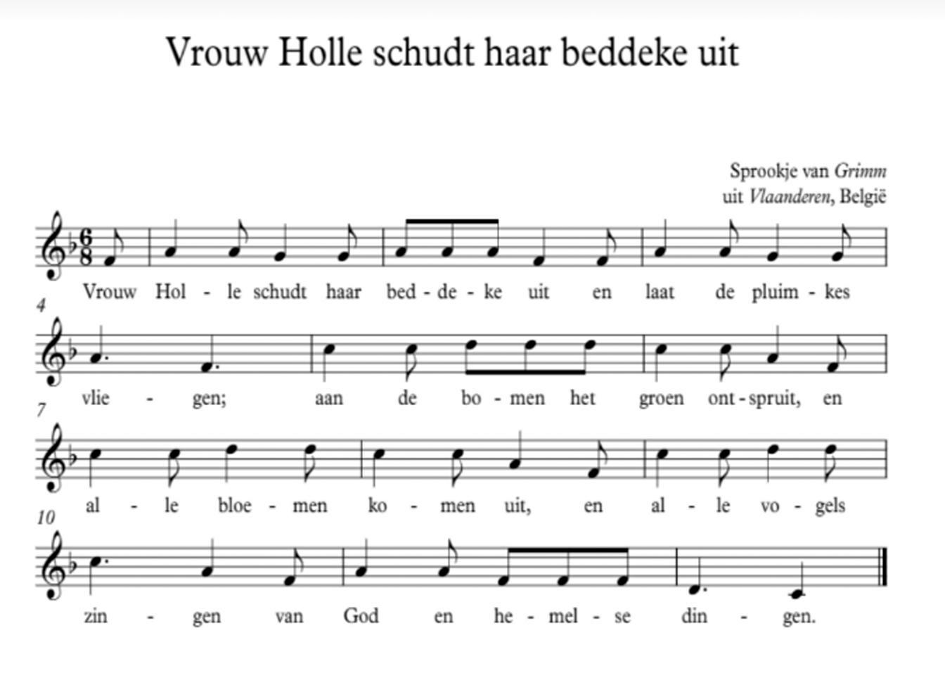 Dan klapten de kinderen in het land van de mensen in hun handen en riepen: ‘Ha. het sneeuwt! Vrouw Holle schudt de dekbedden uit. Nu zal het spoedig Kerstmis zijn!’