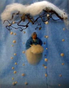 Wanneer de herfstwind de bladeren van de bomen rukte, kwamen de duifjes ook in de rui. Dan verzamelde Vrouw Holle de losse veertjes om ze in haar dekbedden en kussens te stoppen. Maar eerst schudde ze de veertjes van het vorige jaar. die ze niet meer nodig had. over het hele landschap uit. Door de wind mccgcvocrd wervelden die dan vrolijk in het rond, bleven aan de berghellingen kleven, kwamen los en zacht op de bomen van het woud terecht, breidden zich uit over de velden en bedekten ten slotte het hele land met een zachte wollige vacht.