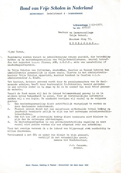De administratie was een onoverzichtelijk geheel. Zowel in de uitvoering van alle administratieve handleidingen, als in het financiële beleid heerste wanorde. Een ondeugdelijk administratiekantoor zorgde daarvoor, alsook de te geringe mankracht en deskundigheid in deze sector binnen de school. Het is een weinig opwekkend verhaal, te complex en te vol met details om daar in deze kolommen verder aandacht aan te besteden. Gelukkig staan de zaken nu weer op een rijtje; in achterstanden en hiaten is weer grotendeels voorzien. Ook het salarisbeleid was in die tijd niet verschoond gebleven van onduidelijkheid. Een groep leraren ontving het subsidiesalaris*. Anderen behoorden tot de maatschap; deze kende gedurende enkele jaren een interne norm. Daarin was het aktenbezit uitgeschakeld; wel speelden mee criteria als burgerlijke staat, leeftijd en kindertal; het salaris werd afgelezen op grond van het opgedragen aantal lesuren en taakeenheden. Veel leraren wilden echter innerlijk tot de maatschap behoren, vonden de daar geldende norm te laag, behóefden evenmin hun subsidiesalaris te ontvangen en gingen er tussenin zitten. Je gooide het met je geweten op een accoordje, marchandeerde een beetje en regelde vervolgens de zaak met de interne penningmeester. Die kon – bij gebrek aan een helder beleid – niet veel anders doen dan ermee instemmen. Veel van die mensen werkten nu immers ónder hun subsidiesalaris en dat was voor de school toch altijd meegenomen. Een overzicht van hoe de salarissen lagen, was bij de leerkrachten niet bekend. Wat lekkages in de wandelgangen zorgden ervoor dat bij geruchten wat gegevens rondgingen. Alle niet even fris. Geld brengt trouwens gemoederen in beweging, dan nog zakelijk blijven is een geweldige opgave.