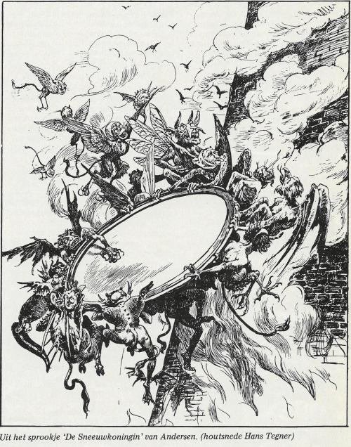Veel 19e-eeuwers zijn hier al de revue gepasseerd. Een, die men niet direct in deze reeks zou verwachten is de Deen Hans Christian Andersen (1805 – ’75) beroemd geworden om zijn sprookjes. Heel anders dan Richard Wagner heeft ook hij zich er niets van aangetrokken dat de tijd van de romantiek voorbij was. In de tijd van opkomende techniek en industrie wist hij met zijn scheppende fantasie de draad van de volkssprookjes op te nemen. Een der bekendste en schoonste en misschien wel de meest dramatische van Andersens scheppingen is de geschiedenis van de Sneeuwkoningin. In het voorspel onderneemt de duivel met de zijnen een uitermate vermetele aanval op de hemel. In zijn ‘school’ voor boze tovenarij vindt hij een spiegel uit die alle dingen tot hun karikatuur of tegendeel vervormt. Deze spiegel draagt hij met zijn helpers omhoog om hem voor Gods aangezicht te houden. De aanval mislukt, de spiegel valt op de aarde, breekt in miljoenen scherven. Veel splinters komen terecht in mensenogen en in mensenharten. Dat gebeurt ook bij het jongetje Kai. Zijn blik op de wereld wordt koud en cynisch. Vanaf dat moment voert zijn levensweg hem rechtstreeks naar het rijk van de Sneeuwkoningin. Alles wat zij aan Kai opdraagt moet in een kil spel van getallen en cijfers worden omgezet. Het is de kleine Gerda. die Kai redt uit de zielendodende macht van de Sneeuwkoningin.