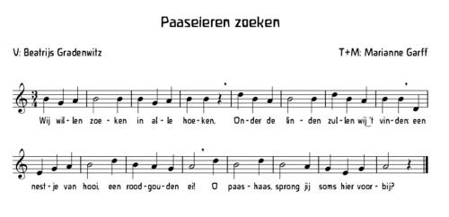 “Wij willen zoeken, in alle hoeken, onder de linde, zullen wij het vinden, een nestje van hooi, een mooi gouden ei, oh paashaas kwam jij soms hier voorbij?…”