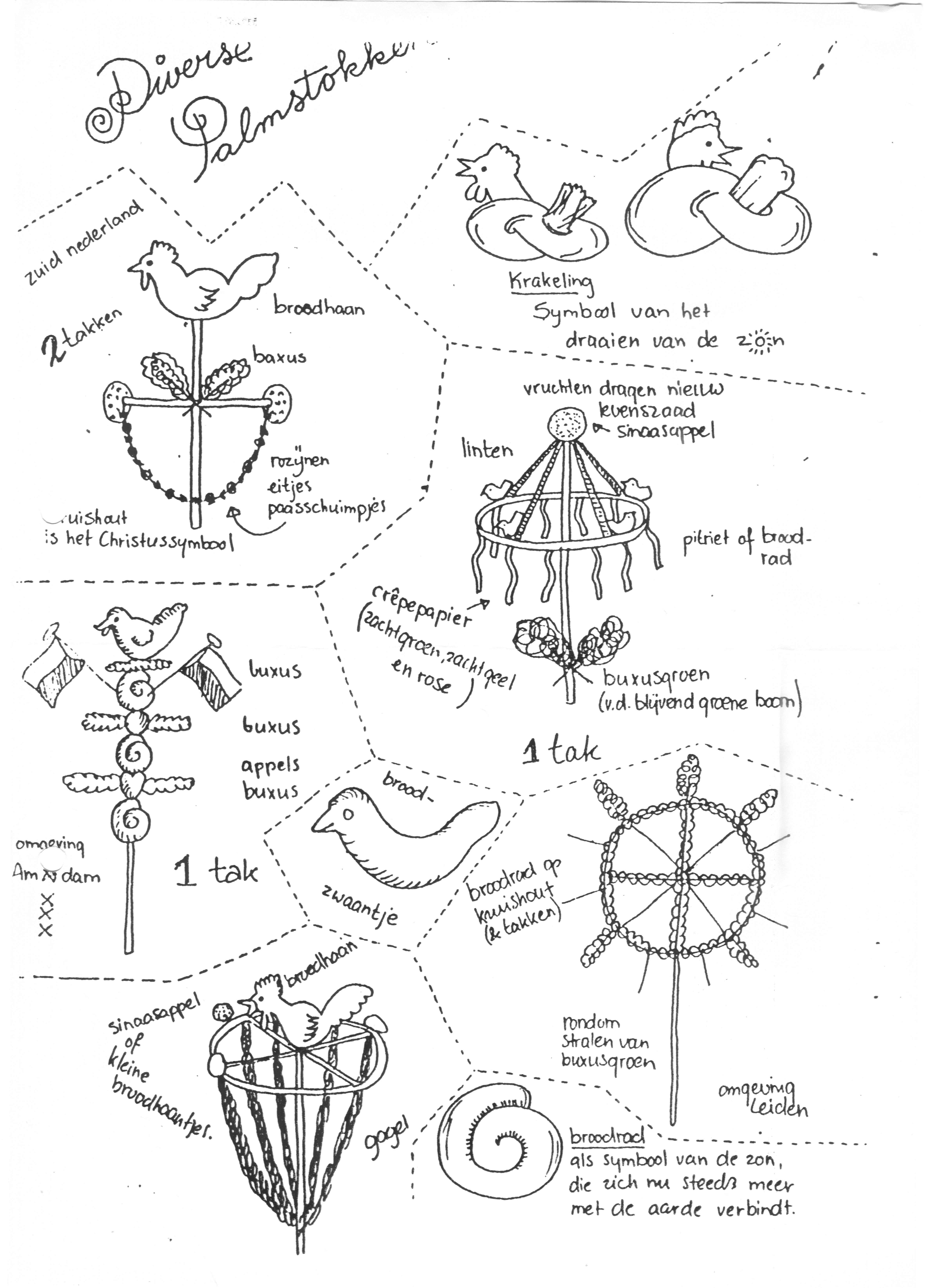 In de kleuterafdeling wordt een zonneradstok gemaakt, nu doen ouders dat thuis, in mijn beginjaren maakten we die stokken op een avond op school met alle ouders, later een tijdje: ouders in de klas [álle ouders] die de palmpaasstok