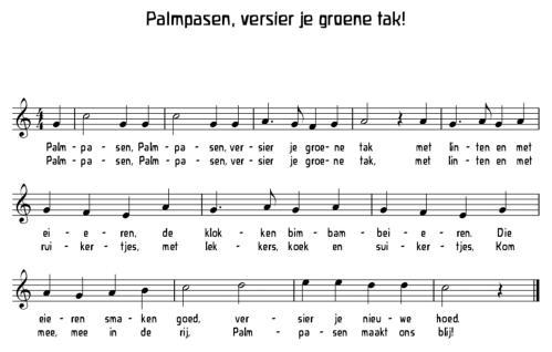Met deze ‘Palmpasen’ houden de kinderen een ommegang. Dit is een overblijfsel van de heidense lente-optochten en van de palmprocessie. Deze processie werd het eerst in Jeruzalem gehouden. Een non uit de Provence, die in de 4de eeuw een pelgrimstocht maakte naar het Heilige Land, vertelt erover in haar dagboek. De gelovigen kwamen op de Olijfberg tezamen en geleidden vandaar de bisschop, die Christus verbeeldde, naar de stad. Allen droegen palm- of olijftakken. Van Jeruzalem uit verbreidde het gebruik zich over het westen.