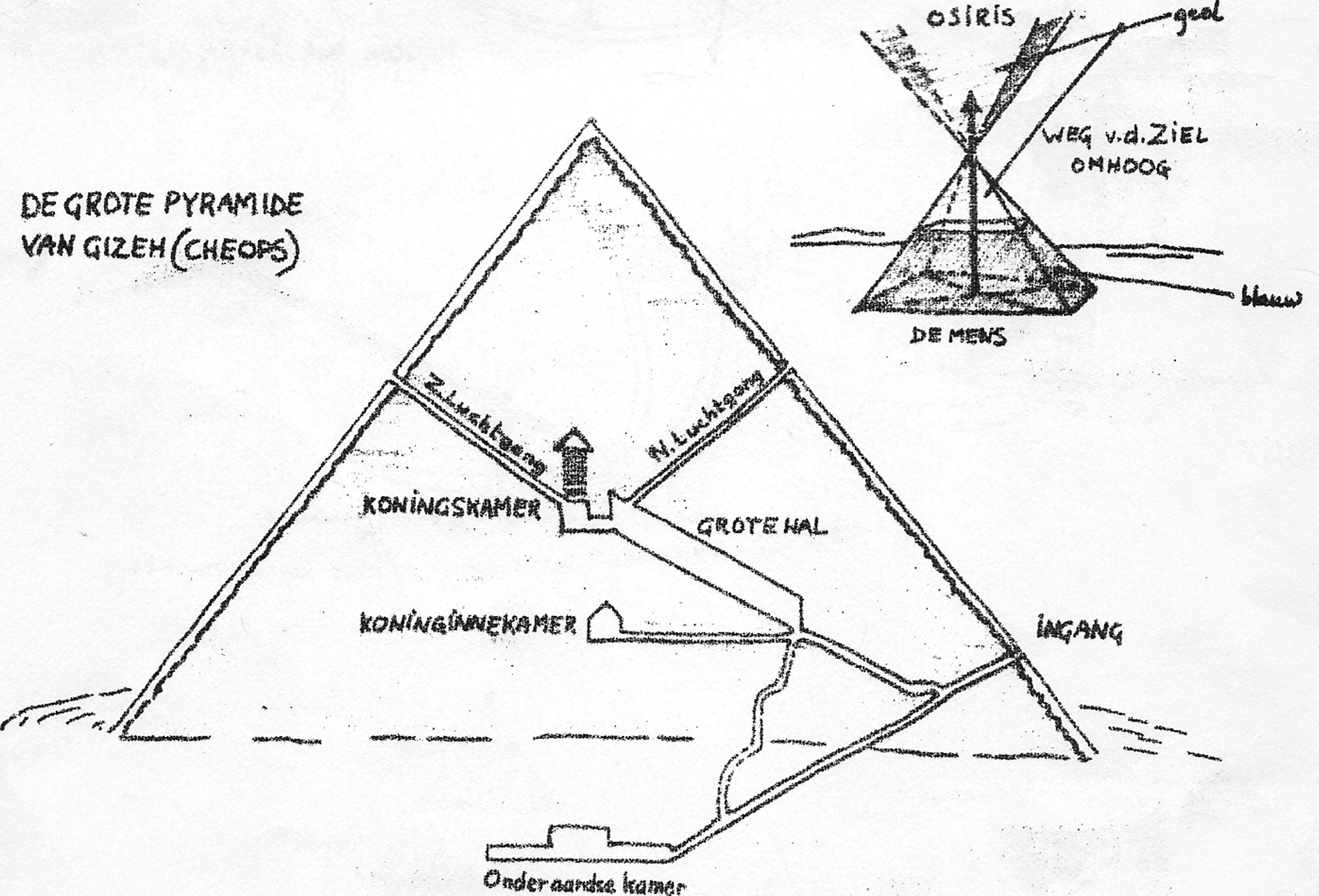 Minstens even spectaculair is de suggestie van Gilbert en Bauval dat de smalle schachten in de piramide van Cheops, die lange tijd als ventilatiekanalen werden beschouwd, een rol hebben gespeeld bij het ceremonieel dat zich daar voltrok. De belangrijkste ‘kamers’ in de piramide van Cheops zijn de zogenaamde koninginnenkamer en de koningskamer waarin men de (lege) sarcofaag aantrof. Vanuit beide ‘kamers’ lopen kanalen schuin omhoog. Het op afstand bestuurbare robotachtige voertuigje Oepoeaut 2, dat in 1993 met een camera door de smalle schachten omhoogsnorde, nam hier de laatste twijfels weg. De schachten bleken rond het jaar 2450 voor Christus exact georiënteerd op Orion (Osiris) en Sirius (Isis). De noordelijke kanalen stonden gericht op de ster uit het circumpolaire gebied die toen de Poolster was: Alpha Draconis. Kennelijk werd de ziel van de dode via deze doorgangen op de een of andere manier geleid naar de Doeat. De Poolster en het gebied daaromheen was vanouds het rijk van Thoëris, de god die een paal of dukdalf aan de hemel had geslagen als een houvast, opdat de ziel niet zijn oriëntatie zou verliezen. Het is niet ondenkbaar, dat de mummie van de farao voor die schacht werd geplaatst om de ziel een eerste oriëntatie te bieden op de wereld van de sterren. Op een vooraf bepaald moment in het sterrenjaar zou de mummie vervolgens verplaatst kunnen zijn en naar het zuiden gericht. In Orion werd de gestorven farao dan tot een sterrenziel .tijdens het ritueel van de mondopening dat zich wellicht voor de betreffende schacht voltrok. Een rituele tekst roept de gestorvene toe tijdens de mondopening: “Uw gelaat is gewassen, uw tranen zijn afgeveegd, uw mond is opengesneden met ijzeren vingers.” In de Doeat kreeg de farao als een nieuwe Osiris aldus zijn stem terug om de magische spreuken ten gehore te kunnen brengen die hem zijn rechtmatige plaats tussen de gestorvenen konden doen innemen. Maar eenmaal tot een Osiris geworden, had de dode farao nog een missie waar heel de voortgang van de Egyptische cultuur van afhing. Hij moest een nieuwe Horus verwekken, die op aarde zijn rechtmatige taak zou voortzetten en die als bij Osiris zijn dood zou wreken op de machten van het kwaad. Voor de schacht die naar Sirius wees zou, getrouw aan de mythologie heel goed een ritueel hebben kunnen plaatsvinden, dat te omschrijven valt als een onbevlekte ontvangenis. Zoals dat eens volgens de mythologie met de dode Osiris was gebeurd, werd de gestorvene met een kunstmatige fallus getooid en bevruchtte zo langs magische weg zijn gemalin in de sterren. Negen maanden later ‘wezen’ de sterren dan de nieuwe Horus aan, die ais het ware incarneerde in zijn opvolger.