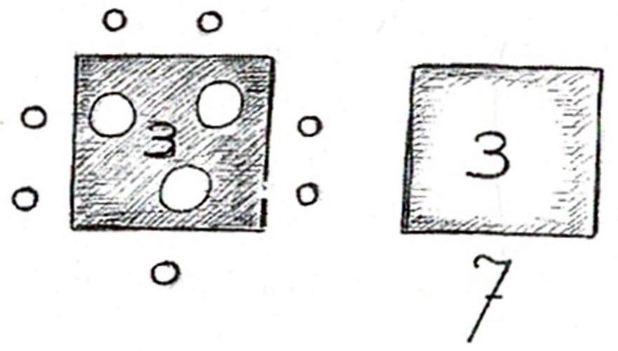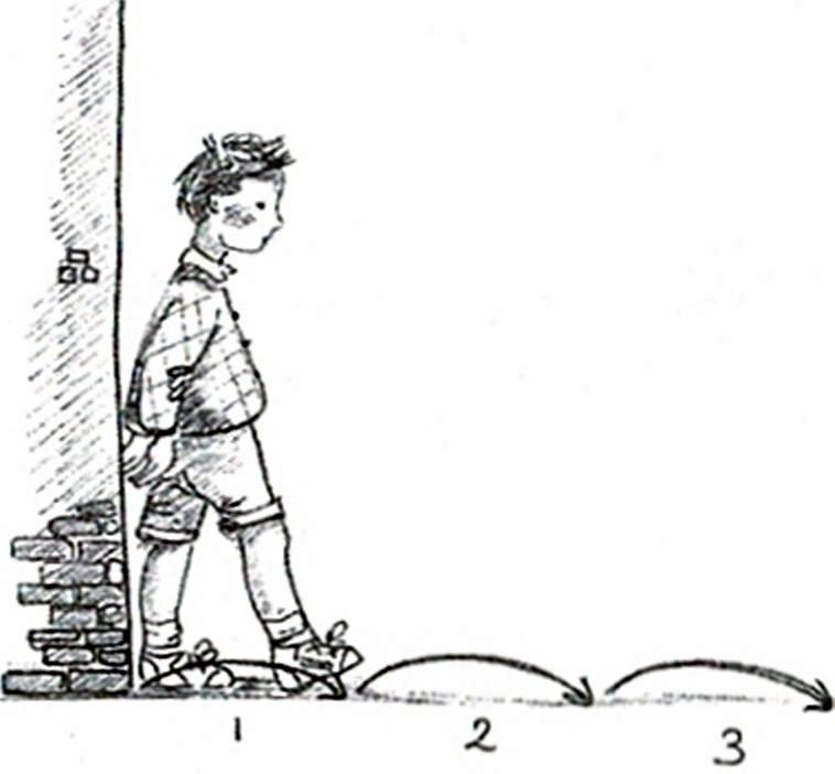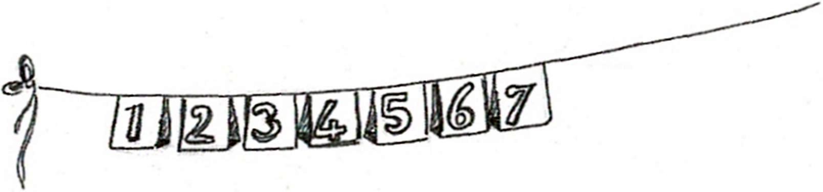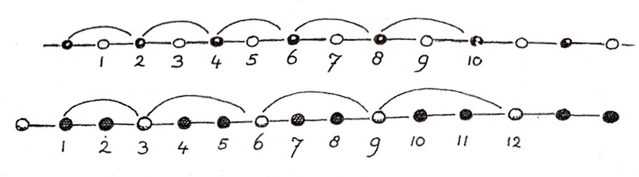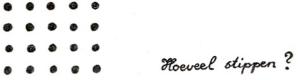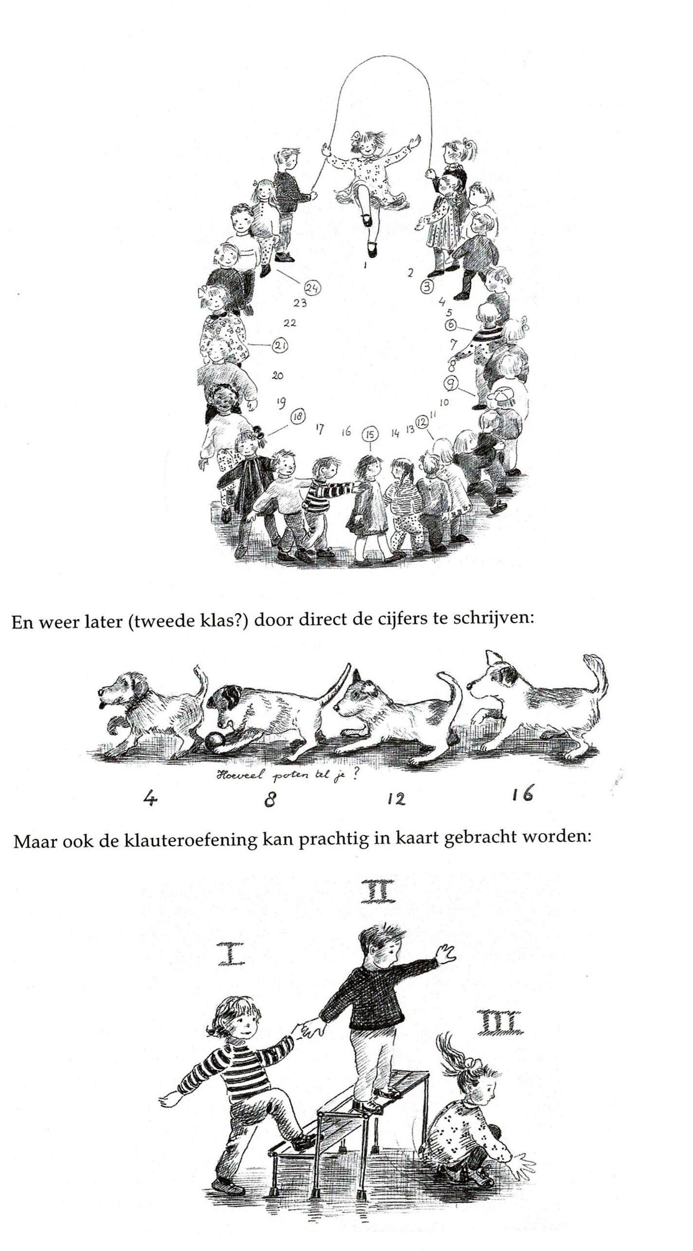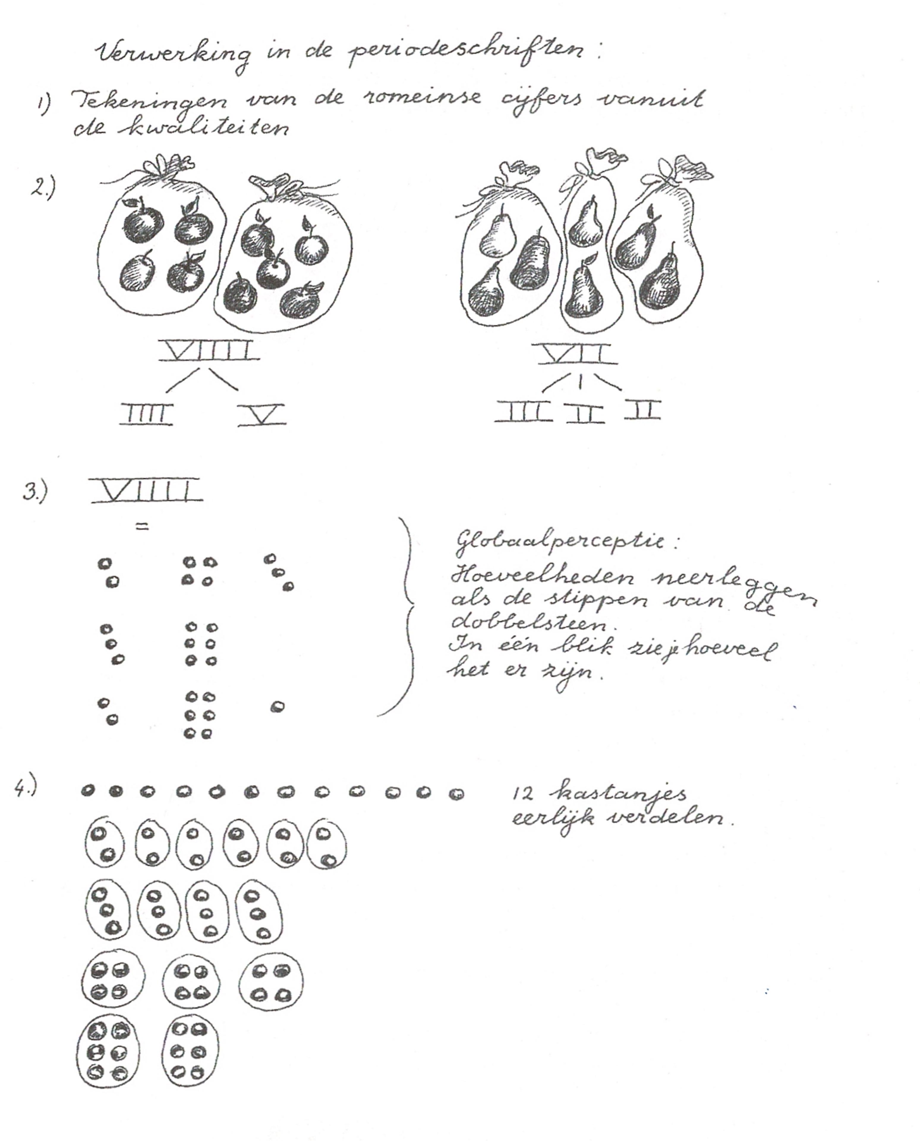 5. Nu zal men er langzamerhand toe over gaan, de kinderen een teken voor deze eenheid bij te brengen. Dan zet je een streep: 1. Men brengt het kind dus bij, dat je voor deze eenheid een streep kunt zetten. De twee kun je voor de kinderen dan zo schrijven: II. Op die manier kom je tot de getallen vanuit de mens zelf, want de mens is levend en niet abstract. (-) Dan kan men verder gaan en zeggen: ‘ Kijk eens, je hebt nog ergens iets wat ‘twee is”. Je vraagt zolang door tot het kind zijn beide benen of voeten gewaar wordt. Nu zeg je: ‘Maar heb je de hond van de buurman gezien? Heeft die ook maar twee voeten? Het kind zal nu ontdekken, dat de in de vier streepjes het staan van buur-mans hond te herkennen is. Zo zal het kind vanuit het dagelijkse leven langzamerhand