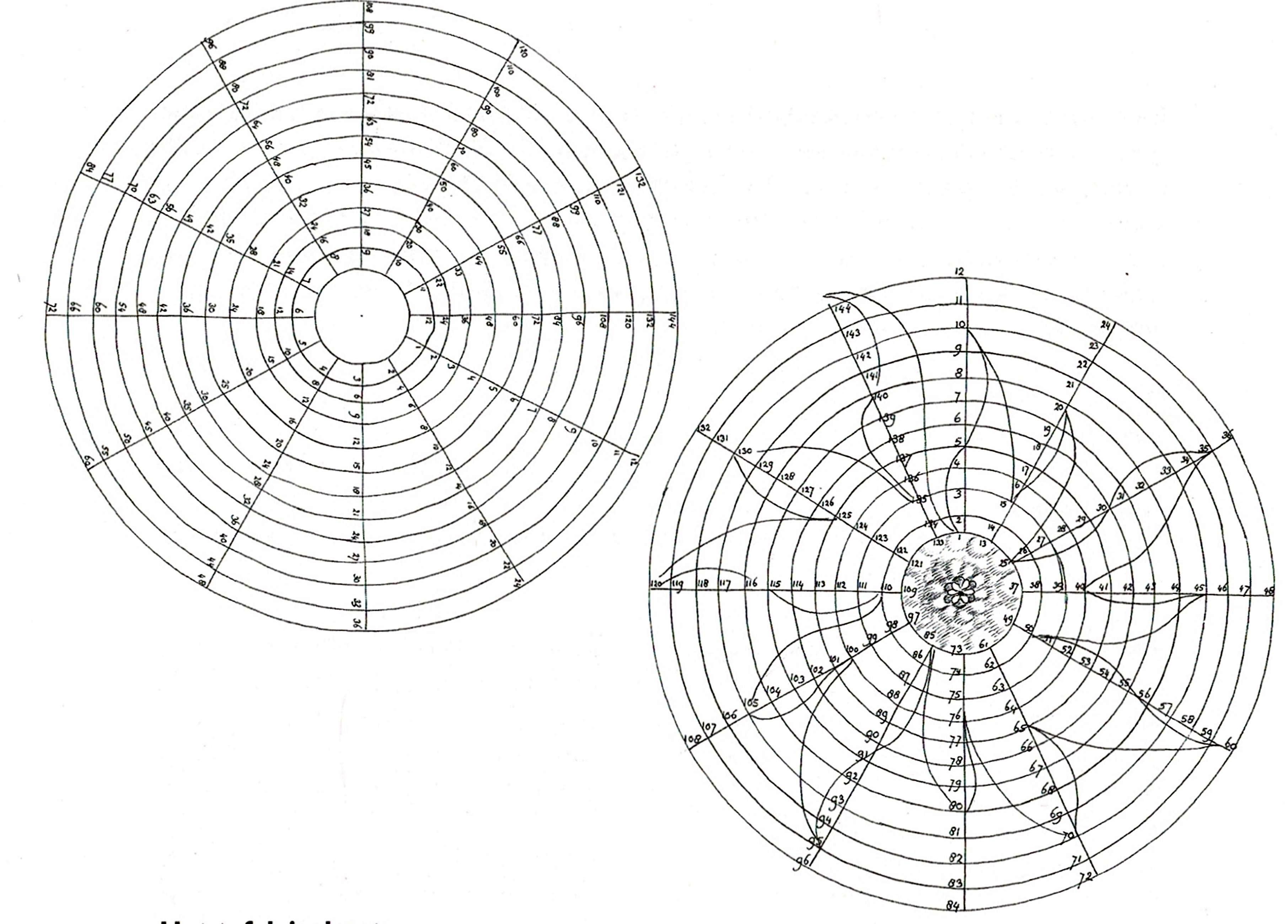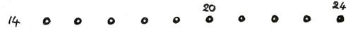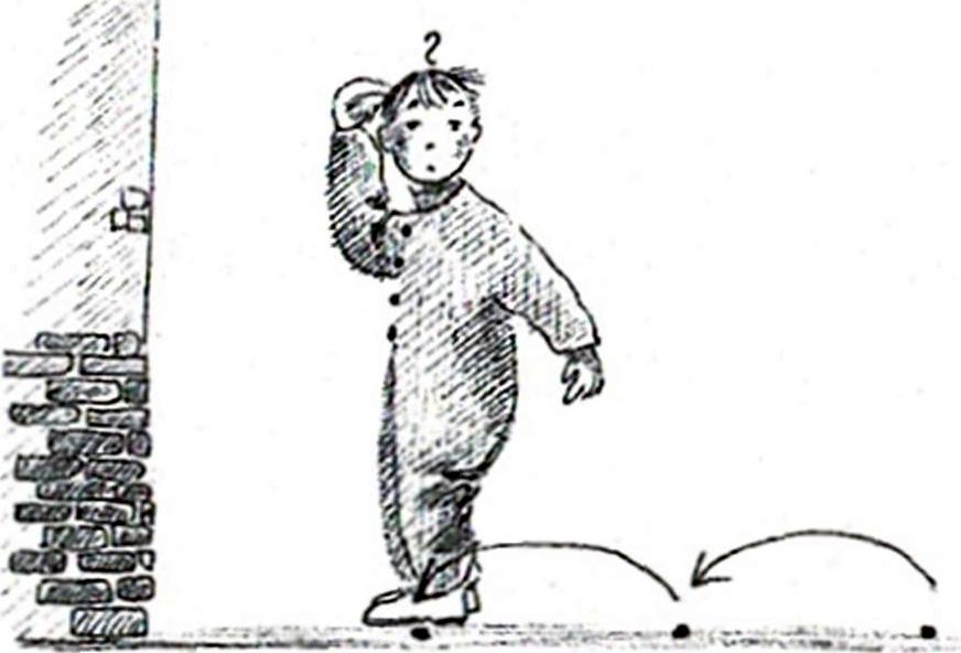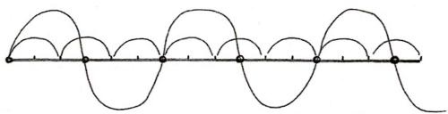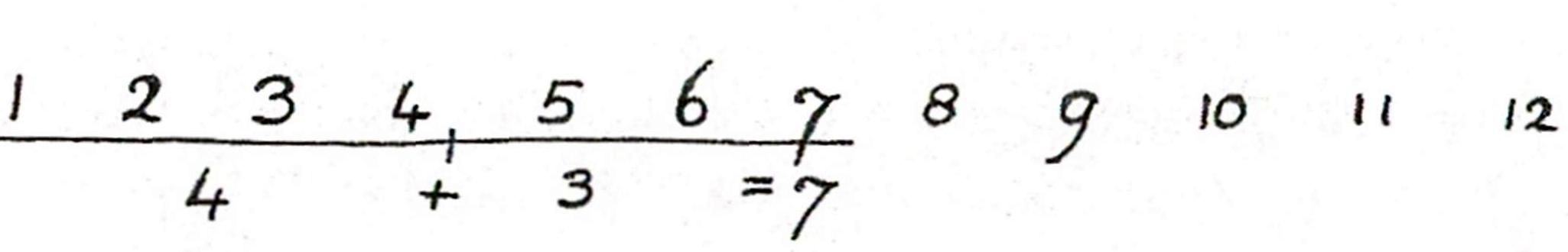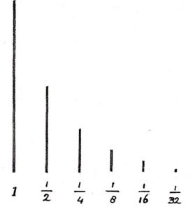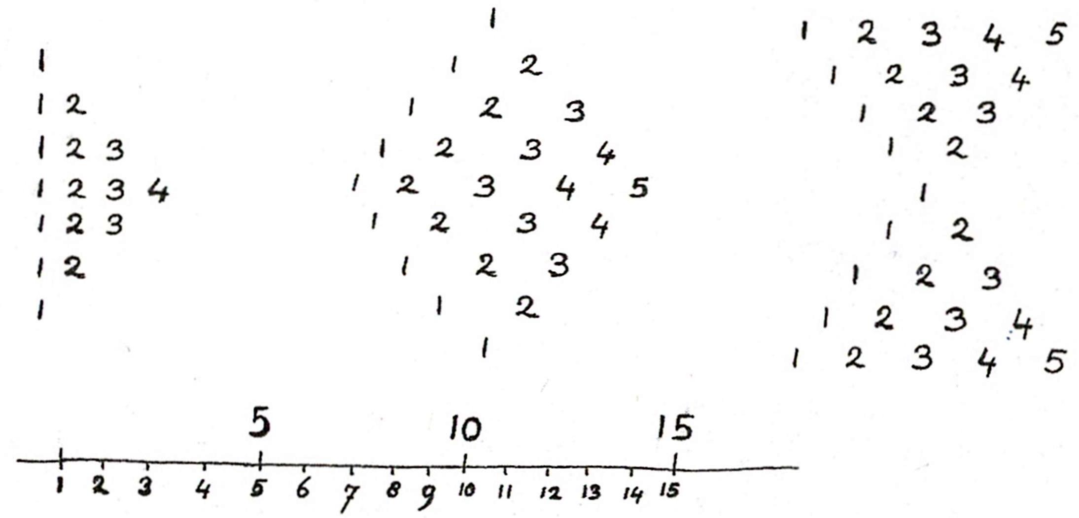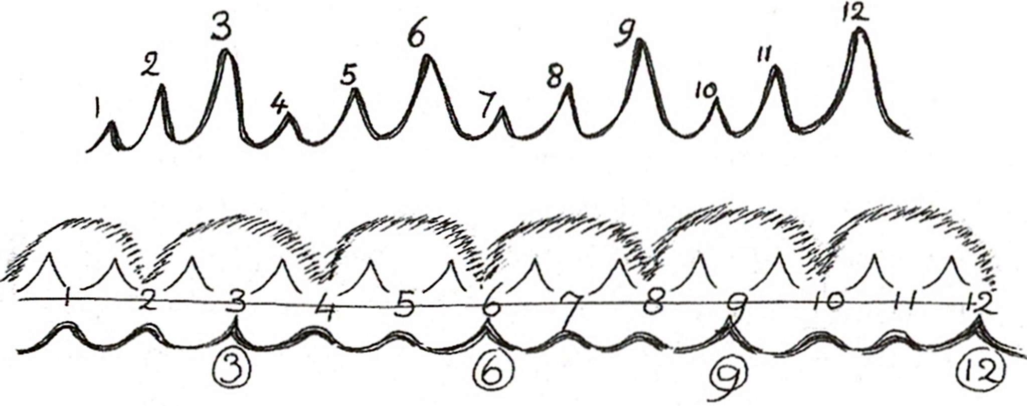5. Nu zal men er langzamerhand toe over gaan, de kinderen een teken voor deze eenheid bij te brengen. Dan zet je een streep: 1. Men brengt het kind dus bij, dat je voor deze eenheid een streep kunt zetten. De twee kun je voor de kinderen dan zo schrijven: II. Op die manier kom je tot de getallen vanuit de mens zelf, want de mens is levend en niet abstract. (-) Dan kan men verder gaan en zeggen: ‘ Kijk eens, je hebt nog ergens iets wat ‘twee is”. Je vraagt zolang door tot het kind zijn beide benen of voeten gewaar wordt. Nu zeg je: ‘Maar heb je de hond van de buurman gezien? Heeft die ook maar twee voeten? Het kind zal nu ontdekken, dat de in de vier streepjes het staan van buur-mans hond te herkennen is. Zo zal het kind vanuit het dagelijkse leven langzamerhand