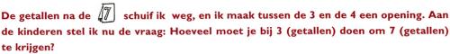 • De aandacht voor kwaliteiten tijdens de ontwikkeling van getalbegrip. Getallen zijn meer dan hun cijfermatige voorkomen en ook meer dan ze als hoeveelheidsgetal voorstellen of als telgetal aangeven. • Het idee van mathematiseren als ontwakend vermogen past goed bij de observaties van jonge kinderen, bezig met de verkenning van hun (getallen)wereld en bij de opvatting dat wiskunde een menselijke activiteit is. • De analytische benadering van het eerste optellen, waarbij de kinderen als het ware een eigen productie kunnen gaan maken: 7 =… + … • Het grote belang dat wordt toegekend aan hoofdrekenen. • De opvatting dat rekenen een ambachtelijke (volg de algemene afspraken) en een creatieve kant (schep je persoonlijke strategieën en kennis van de getallenwereld) heeft. • De programmering van het onderwijs langs de lijnen van de wordingsgeschiedenis kan heel goed stroken met de ideeën van de genetisch-historische didactiek en de geleide heruitvinding. • Het feit dat het periode-onderwijs het mogelijk maakt exemplarisch te werken en grote leergangen intensief aan de orde te stellen. • Het in verband brengen van de ritmiek van het bewegen met patronen op de getallenlijn. 29