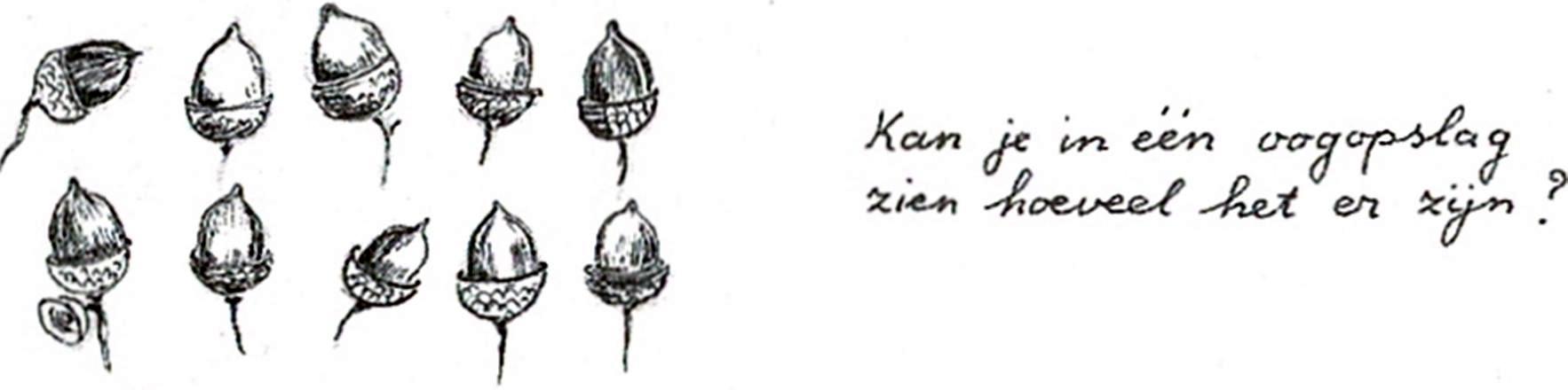 omgehangen en vraagt hoeveel kralen er aan geregen zijn, heeft een zak vol knopen bij zich en vraagt een groep kinderen die te sorteren, signaleert dat er kinderen zijn die nog a-synchroon tellen, bedenkt teloefeningen voor deze kinderen, ziet dat een bepaalde leerling de 2 spiegelbeeldig schrijft, …
