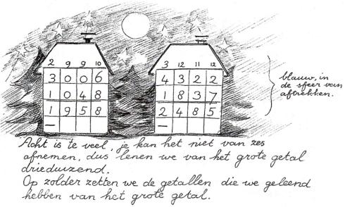 Met het bovenstaande is de opbrengst van het onderzoeks- en ontwikkelwerk globaal weergegeven. Twee interessante aanvullingen mogen evenwel ook niet ongenoemd blijven. In de eerste plaats wijzen we op, wat men noemt, de recon-structie-didactiek. Het is de realistische invulling van het onderwijs in de basisvaardigheden en staat haaks op de mechanistische reproductie-didactiek. In het laatste geval worden basisvaardigheden als 14 – 6 = 8 en 8 x 7 = 56 aangeleerd volgens de methode voordoen-nazeggen-inslijpen-opzeggen-toepassen. In de realistische leergangen is, zo werd eerder getoond, de gang van zaken anders. Men begint met verkenning en begripsvorming, geeft leerlingen ruimte voor eigen constructies (in dit geval reconstrueren de leerlingen 14 – 6 op basis van kennis, die ze al bezitten en het handig gebruik maken daarvan, bijvoorbeeld ’14 = 7 + 7, dus 14 – 6 = 7 + 1 = 8′, of ‘4 – 6 is 2 tekort, dus 14 – 6 = 10 – 2 = 8’.