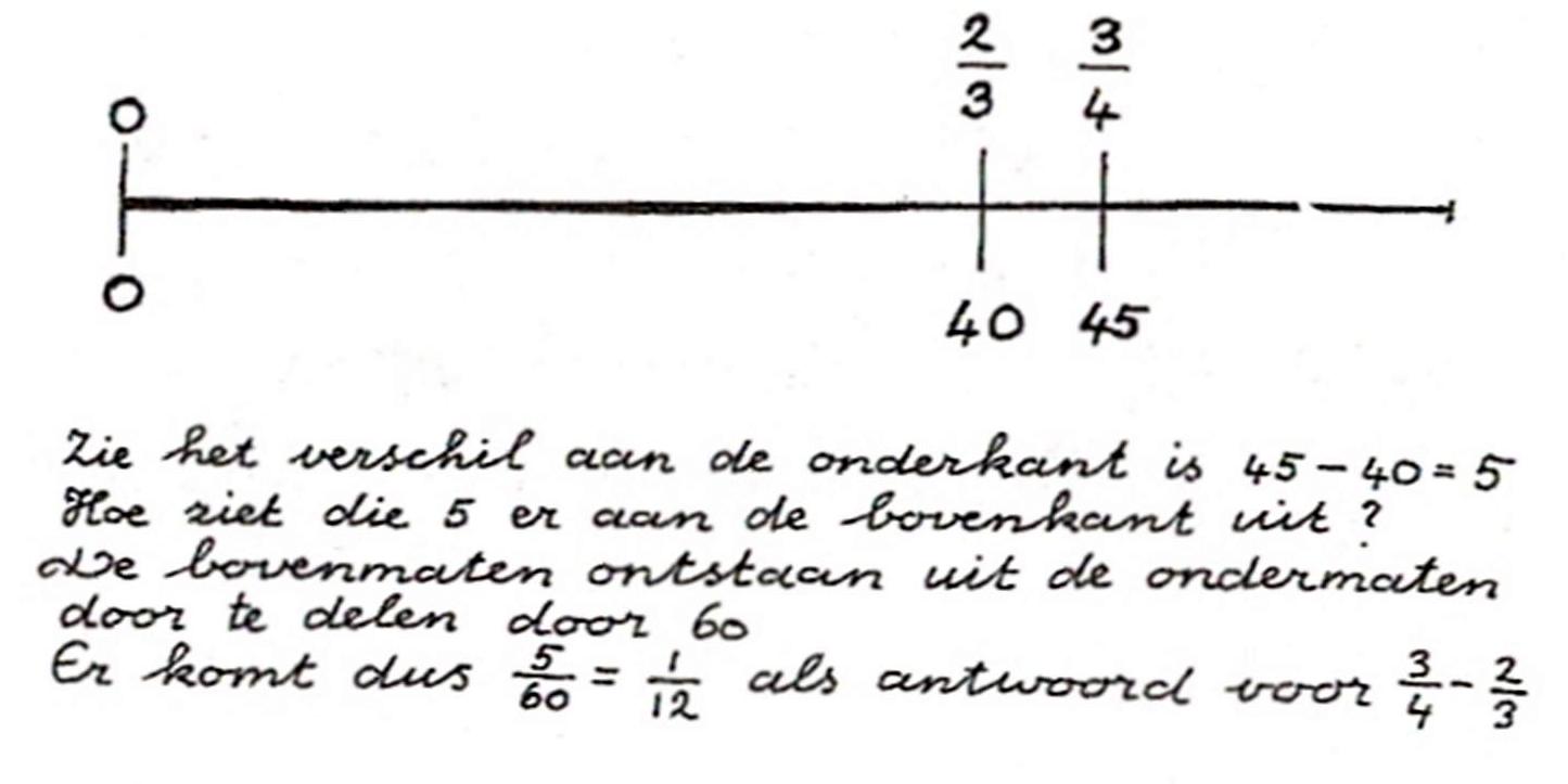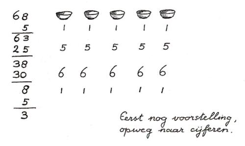 plicering’. Men begon met eenvoudige getallen (bijvoorbeeld 2 / 12 \ om het staartdelen te beginnen) en liet daaraan zien hoe de rekenwijze stapsgewijs tot het goede antwoord voert. In elke volgende fase van de leergang werden de getallen groter en soms werd het rekenen gecompliceerder (bijvoorbeeld 2 / 102 \ of 12 / 144 \, ga maar na). Bij progressieve schematisering wordt gestart met een probleemsituatie, die onderzoek vereist en waarbij het rekenwerk eerst nog georganiseerd moet worden. Het organiseren van rekenwerk (denk bijvoorbeeld aan de opgave om uit te zoeken hoe vaak een minibus voor 12 personen zou moeten rijden om 196 personen van het hotel naar de steiger te brengen) wordt op zichzelf ook deel van het onderzoek. Men gaat systematisch werken, ziet een handig te gebruiken (notatie-) schema en gebruikt dat, misschien in verbeterde vorm, om een volgend probleem op te lossen. Zo ontwikkelen de kinderen in deze leergang ‘hun eigen’ rekenwijze, gezamenlijk met de anderen en zoveel mogelijk een werkwijze volgend, die door het gezonde verstand wordt ingegeven. Een groot voordeel van deze aanpak is, dat er verschillende niveaus van handelen (rekenen) blijken te zijn, waarop de leerlingen al naar hun begaafdheid en gevorderdheid de aangeboden problemen kunnen aanpakken en oplossen. (Bijvoorbeeld in het geval van de minibus kunnen kinderen eruit komen door van 196 steeds 12 af te trekken; meer gevorderden zullen misschien direct beginnen met er 120 af te trekken, en dan van de overgebleven 76 in een keer (6 x 12 =) 72. Dat deze werkwijze ondersteund kan worden door een handig schema, kan op blz.135 nagelezen worden.) Schema’s, die tijdens de leergang in ontwikkeling zijn (het wordt eerst uitgevonden, dan beter vormgegeven, dan worden verkortingen aangebracht), krijgen soms de kracht van een denkmodel (denken aan het schema helpt het rekenwerk te organiseren en geeft er richting aan). Bekende denkmodellen in het Wiskobaswerk zijn onder meer getallenlijn, abacus, rechthoek-model en verhoudingstabel.
