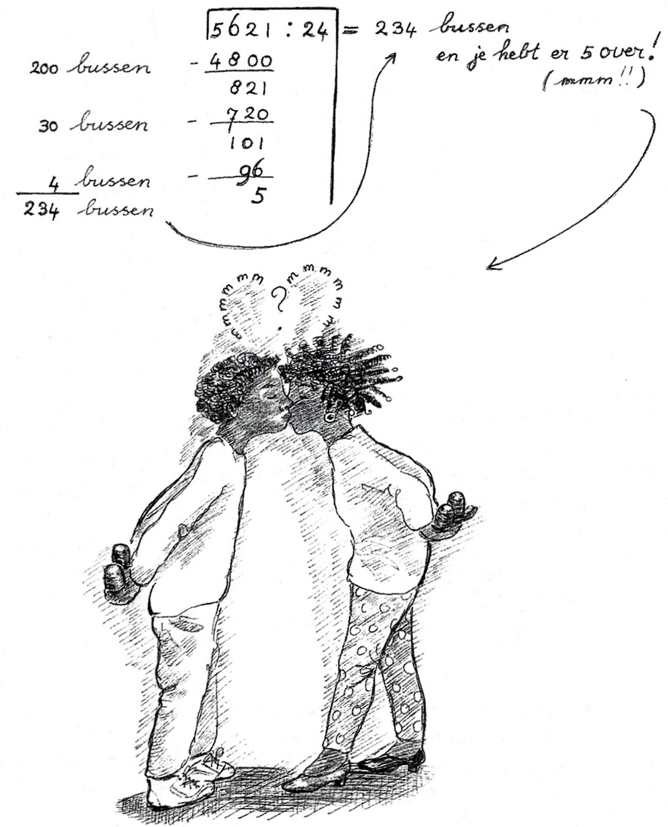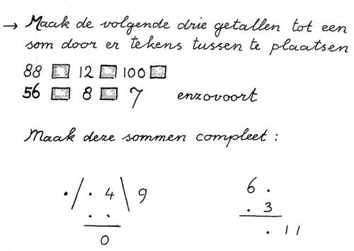 Kinderen komen doorgaans naar school met een geweldige leergierigheid: ze willen groot worden, dat wil zeggen dat ze een weg willen vinden in de cultuur van de volwassenen. In onze tijd behelst deze weg een lang traject. Terecht wordt daarom een flink deel van de schooltijd besteed aan het verwerven van de basiskennis van onze cultuur: taal en rekenen. Dat gebeurt voor een groot deel in doorgaans witgekalkte gemeenschapsruimten, klaslokalen, waar onderwezen wordt. In enkele andere culturen waren deze instituties niet nodig. Men had andere ‘opvoedingspakketten’ beschikbaar, als rituele dansen, reciteren en het zingen van heldenliederen of, om iets heel anders te noemen, het beoefenen van de vijfkamp. De opvoedingsdoelen van die samenlevingen pasten bij de wijze, waarop het leven ingericht was en stonden daardoor dicht bij de natuurlijke vermogens van het kind, met zijn bewegingsdrang, z’n behoefte aan ritme en beeld en zijn natuurlijke behoefte aan religiositeit. In onze westerse samenleving van de jaren negentig (multicultureel, technologisch, emancipatorisch) moeten we de kinderen binnen leiden in een cultuur, die een hoge mate van abstraherend vermogen verlangt. Vanuit rekendidactisch standpunt moet daaraan worden toegevoegd dat het gaat om abstrahering met behoud van inzicht en abstracties die in nauwe relatie staan met concrete situaties. Abstrahering wordt, van dat standpunt gezien, tot stand gebracht door reflectie. Wiskunde moet men dan ook zien als het denken over het eigen handelen. Dat kan handelen op materiëel niveau zijn, maar evengoed is hier mentaal handelen bedoeld. We willen het verantwoord doen en het onderwijs onder andere ook maken tot een middel om het geheugen te trainen en de wil te sterken. Terecht! De grote kunst zal daarbij zijn om het evenwicht tussen middel en doel te bewaren en niet het een met het ander te verwarren. Als middel tot doel wordt, zouden we wellicht betere middelen kunnen bedenken dan scholen! Het doel kan alleen zijn, de kinderen aansluiting te laten vinden aan hun cultuur: kundig maar ook kritisch. De middelen reikt het kind ons aan: de drang tot bewegen, het gevoel voor ritme cn de mogelijkheid van creativiteit. En we maken gebruik van het groeiende reflectieve vermogen dat tot uiting komt in verstand en geheugen. Maar het vereist veel kennis en inzet om deze vermogens goed vorm en richting te geven. Hier past tenslotte een variatie op een reclamekreet: meesterschap is vakmanschap! 19