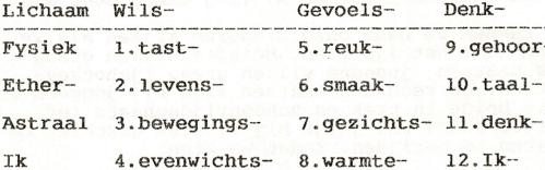Bovendien: de hele mens wordt aangesproken, en dat is lang niet bij alle sporten het geval. De vier zintuigen waarover ik het had hebben een relatie tot de vier wezensdelen: fysiek lichaam – etherlichaam (levenslichaam) – astraal lichaam (gevaar-wordingslichaam) en Ik. Maar alle 12 zintuigen hebben dat. Naast de vier wilszintuigen onderscheiden we ook nog vier gevoelszintuigen en vier denkzintuigen. Eerst een overzicht: