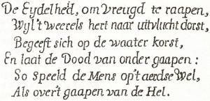 Het is niet nieuws inde plaetsen daer men ghewoon is Schaetsen te ghebruycken, dat een Man valt, soo hy de moet heeft, dat hy weder op staet, en gaet zijn gangh oft niet gheschiedt en waer; daer men mede te verstaen wil gheven, dat niemand haest om een kleyn ongheval den moet verliesen sal, het zy in zijn Rijckdom, in zijn Reeckeninghe, in zijn Ridderlijcke daden, in zijn Amoreusheden, dan moet met den Alchimist dencken: noch eens sal ick dat gaen beghinnen, per avontuere sal’t dan wel zijn gheraeckt; ende soo het weder den selven gangh gaet, moet men de plaetse veranderen ende soecken onbekende lieden, daer de kloeken een andere klanek gheven.