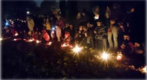 Wij eten op de avond van 11 november in het donker met het kaarslicht van onze lantaarns.