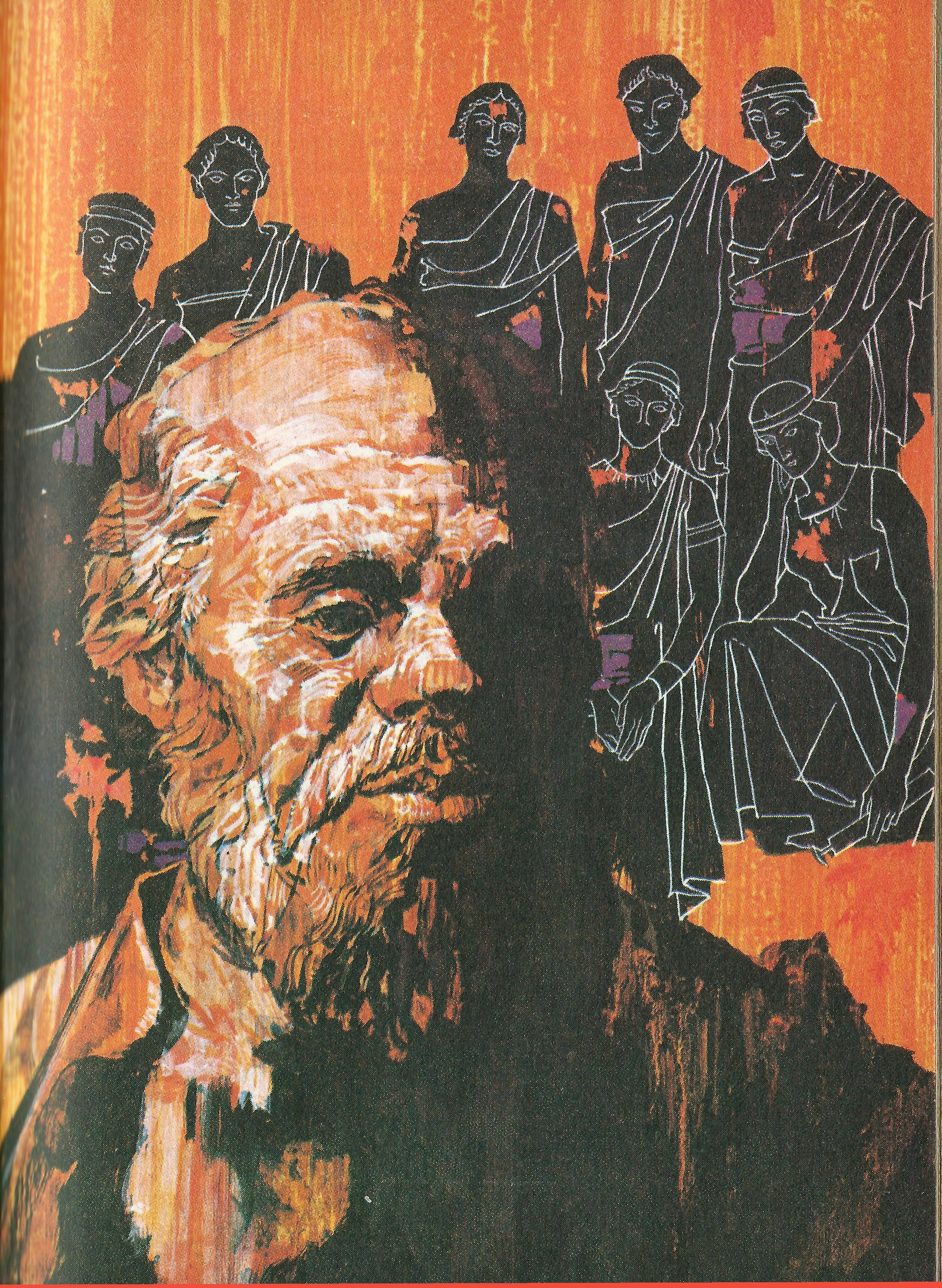Hij was een man die een vermakelijke aanblik opleverde: een schedel, hoog en kaal als de koepel van een openbaar gebouw, een gezicht dat verhoudingsgewijs heel klein was, een ronde wipneus en een lange, golvende baard die niet bij zo’n eigenwijs gezicht scheen thuis te horen. Zijn lelijkheid was voor zijn vrienden een spreekwoordelijk mopje en hij van zijn kant deed er nog een schepje bovenop. Hij was een arm man die graag lanterfantte; steenhouwer van beroep, een tweederangs beeldhouwer. Maar hij deed geen slag werk meer dan nodig was om zijn vrouw en drie jongens in leven te houden. Hij praatte liever. En omdat zijn vrouw een helleveeg was met een griezelig scherpe tong, was hij het liefste van huis weg.