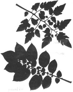 Het aardappelblad (onder) en het tomatenblad (boven) zijn verwant. Beide bladeren bestaan uit geveerde blaadjes, waarbij die van de tomaat nog eens geveerd zijn. Bovendien komen bij beide bladeren tussen de grote ook nog kleine uit de middennerf.