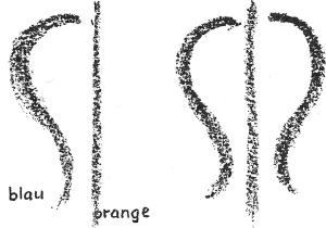 Het is ook mogelijk door de kleur het karakter van een lijn of een vorm nog te benadrukken. De actieve kleuren zoals rood en oranje zijn meer geschikt voor het dynamische, blauw en groen daarentegen ondersteunen de statisch-rustende vormen. Vanzelfsprekend laat je het ook steeds weer aan het kind over om de ene of de andere kleur te kiezen.